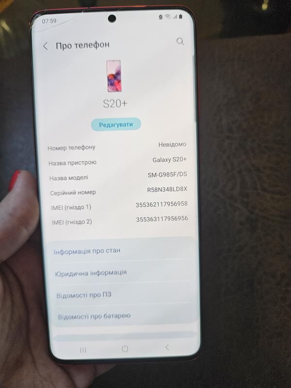 Продам телефон Samsung Galaxy S20+ DUOS (128Gb) Red, пользовалась 2 года, в хорошем состоянии, всегда носился с плёнкой и чехлом, есть небольшая трещина в углу экрана (но никак не мешает работе телефон). Нет никаких проблем в пользовании, не глючит. Работает прекрасно. Продаю в связи с покупкой новой модели.