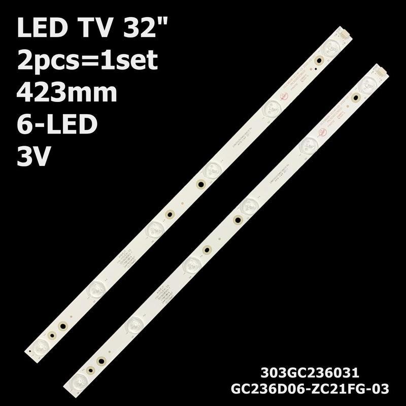 Кілька примірників у наявності Артикул: ART-12509 Ціна за комплект з 2-х планок Тип підкладки: алюміній Довжина планок: 423 мм Ширина планок: 17 мм Напруга одного світлодіода: 3V Кількість контактів на роз'ємі: 3 pin Кількість світлодіодів на планці: 6 LED Відстань між світлодіодами по центру: 77-79-77-79-77 мм Відстань між центром 1-го та останнього LED: 388 мм Маркування планок: - GC236D06-ZC14F-03 303GC236031 Підсвітка підійде до моделей: - Ergo: LE24CT5500, LE24CT5000, LE24CT2020, LE24CT4000, LE24CT1020, LE24CT1, LE24CT2000AK, LE24CT5500, LE24CT4000AU, LE24CT5000AU - Changhong: LED24B3060 та інші. Аналоги планок: - GC236D06-ZC21FG-03 303GC236041 Підсвічування матриці (панелі): - K236WL2 - BOEI236WX1 УВАГА: Перед продажем перевіряється кожна планка на працездатність спеціальним тестером. Настійно не рекомендується перевіряти світлодіодні лінійки пристроями, які безпосередньо не призначені для цього. У нас ви можете замовити пристрій для перевірки працездатності підсвічування LED підсвітки Довжина одної планки (мм): 423 Діагональ (дюйми): 32" Загальна довжина планок (мм.): Використовується одна суцільна планка Кількість LED діодів на планці (шт.): 6 Кількість планок в комплекті (шт): 2 Напруга одного LED діода: 3V