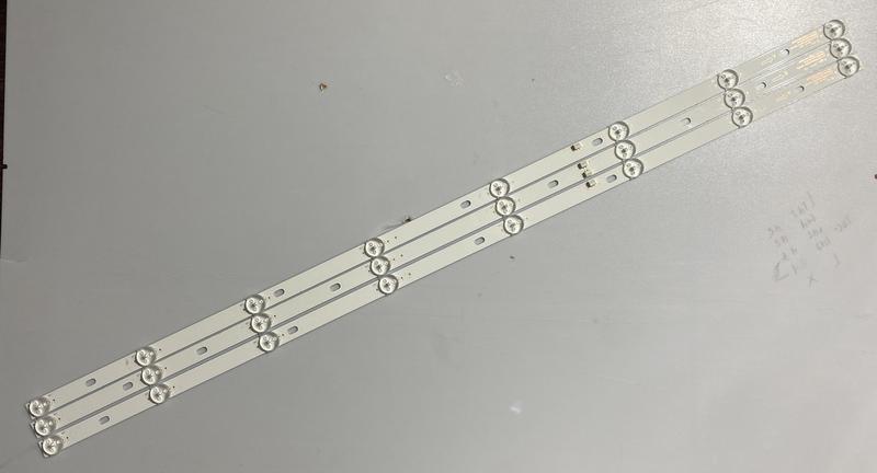 Комплект планок LED підсвітки JS-D-JP395DM-A81EC + JS.D-JP395DM-B82EC характеристики: - Маркування: - JS-D-JP395DM-A81EC (80105) - JS.D-JP395DM-B82EC (80510) - E395DM1000 MCPCB - Робоча напруга одного світлодіода: 6 В - Висота планки (підкладка + лінза): 7 мм - Діагональ екрану: 40″ - Діаметр світлорозсіювача: 16 мм - Довжина кожної планки: 736 мм - Кількість контактів на роз'ємі: 3 - Кількість світлодіодів на кожній планці: 8 шт. - Матеріал підкладки: алюміній - Відстань між центрами отворів для кріплення: - A тип: 168-120-169-169 мм - B тип: 68-118-198-118-68 мм - Відстань між центрами світлодіодів: 94-99-108-114-107-99-96 мм - Відстань між центром 1-го та останнього LED: 714 мм - Тип світлорозсіювача: округлий - Ширина підкладки планок: 14 мм - Застосування: ремонт задньої (Direct LED) підсвітки телевізорів - Гарантія: 6 міс. Застосовуються для ремонту телевізорів в наступних матрицях (панелях): - V400HJ6-PE1 - D40-M30 та інших. Сумісність з моделями телевізорів діагоналлю 40″: - Akai: UA40DM2500S - BBK: 40LEM-1043/FTS2C, 40LEM-1043, 40LEX-5043/FT2C - Crown: 40T21100C - Elenberg: 40BF400 - Fusion: FLTV-40B110T - Jpe: E40DM2100 - Hyundai: H-LED40F451BS2. - Hoffscon: A40HD300T2 - Orfey: 40LD105 - Nordmende: ND40N2100JLX та іншими. УВАГА: - Бажано перед здійсненням покупки звірити маркування LED планок з маркуванням товару на сайті. Іноді маркування на товарі може не збігатися з тією, що вказана на ваших планках, хоча і повністю сумісна або телевізори певної моделі можуть містити підсвічування відмінне один від одного в залежності від партії виробництва. Якщо у вас є сумнів яке підсвічування Вам потрібне, то зателефонуйте для уточнення і консультації. - Перед продажем перевіряється кожна планка на працездатність спеціальним тестером. Настійно не рекомендується перевіряти світлодіодні лінійки пристроями, безпосередньо не призначеними для цього. У нас ви можете замовити пристрою для перевірки працездатності LED підсвічування в розділі обладнання для діагностики. Можлива проклейка теплопровідного скотча за запитом. Повний комплект складається з 3-х планок: - JS-D-JP395DM-A81EC - 2 шт. - JS.D-JP395DM-B82EC - 1 шт. Ціна вказана за повний комплект з 3-х світлодіодних планок.