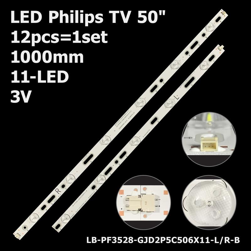 Артикул: ART-12770 Ціна за комплект з 12-и планок Тип підкладки: алюміній Довжина планок: - Планка L: 448 мм - Планка R: 552 мм - Планки L+R в зборі: 1000 мм Ширина планок: 17 мм Напруга одного світлодіода: 3V Кількість контактів на роз'ємі: 2, 3 pin Кількість світлодіодів на планці: - Планка L: 5 LED - Планка R: 6 LED - Планки L+R в зборі: 11 LED Відстань між світлодіодами по центру: Маркування планок: - LB-PF3528-GJD2P5C506X11-L-B, LB-PF3528-GJD2P5C506X11-R-B - LB-PF3030-GJABL506X11AFJ2-L-H, LB-PF3030-GJABL506X11AFJ2-R-H - LB-PF3030-GJUHD496X11ADY2(11P)-L-H, LB-PF3030-GJUHD496X11ADY2-R-H - GJD500611001-X3-L, GJD500611001-X3-R Підсвітка підійде до моделей: - АОС: LD50P03Q - Philips: 50PUT6400, 50LB371U, 500TT61, 50PFL6340/T3, 50PFF2651/T3, 50PFF3655/T3, 50PFF5655/T3, 50PFF3750/T3, 50PFF3750, 50PFF4750/T, 50PFF3/T3, 55PUF6092/T, 50AH42L, 50PUH6400, 49PUF6401/T3, 49PUF6701/T3, 49PUH4900, 49PFS5301/12, 500TT25, 500TT26 V5, 500TT66, 500TT65 V1, 500TT67 V2, 500TT68 V2, 50PFF5659, 50PFF5650, 49PFF3655, 49PFF5755 - Sharp: LC-50LB261U, LC-50LB370U, YX-50018014 - Skyworth: 50E3100, 50V5, 50M5 Аналоги планок: - LB50035 V1-00, LB50035 V0-00 - GJD500611002-X2-L, GJD500611002-X2-R Підсвічування матриці (панелі): - 2G11 - TPT500DK-QS1 - TPT490U2-EQYSH - TPT500J1-LE8 УВАГА: Перед продажем перевіряється кожна планка на працездатність спеціальним тестером. Настійно не рекомендується перевіряти світлодіодні лінійки пристроями, які безпосередньо не призначені для цього. У нас ви можете замовити пристрій для перевірки працездатності підсвічування LED підсвітки