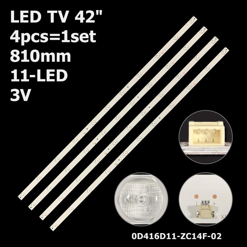 Артикул: ART-11595 Ціна за комплект з 4-х планок Тип підкладки: алюміній Довжина планок: 810 мм Ширина планок: 17 мм Напруга одного світлодіода: 3V Кількість контактів на роз'ємі: 3 pin Кількість світлодіодів на планці: 11 LED Відстань між світлодіодами по центру: 74-82-83-81-67-67-81-83-82-74 Маркування планок: 0D416D11-ZC14F-02 303TT416031 Підсвітка підійде до моделей: - Panda LE42F15, LE42F15S1, LE42F15S2, LE42F15S3, L42F15S1, L42F15S2, L42F15S3, LED4218 - Sanyo E42H1900 - Sharp LE42H, LE42H Аналоги планок: - 0D416D11-ZC14F-02 - 303TT416031 - 2010006178-1 - 150402B2 - CC********** - 416D3503V1W11C1B81017M-HJ-G Підсвічування матриці (панелі): V420HJ2-P01 УВАГА: Перед продажем перевіряється кожна планка на працездатність спеціальним тестером. Настійно не рекомендується перевіряти світлодіодні лінійки пристроями, які безпосередньо не призначені для цього. У нас ви можете замовити пристрій для перевірки працездатності підсвічування LED підсвітки