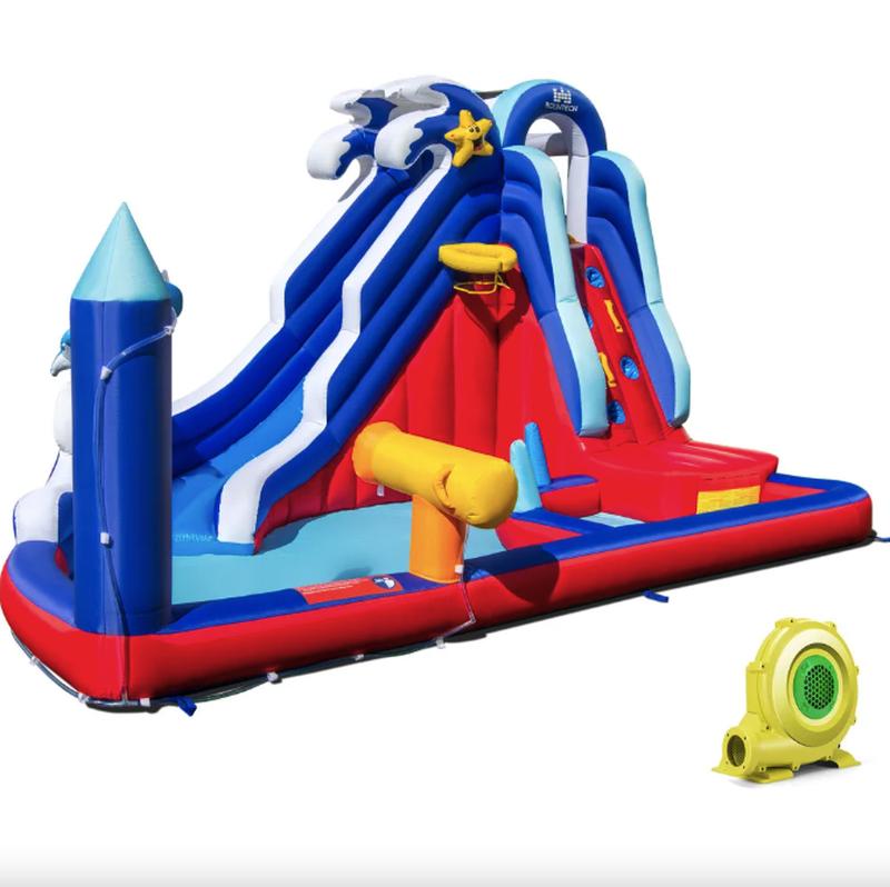 Надувний аквапарк Costway Slide 6-в-1 з гіркою для скелелазіння Коли на вулиці літо, діти мріють про щось більше, ніж просто звичайний двір. Вони мріють про пригоди, виклики, шалені гірки та радісні сплески. Надувний Аквапарк 6-в-1 з басейном для скелелазіння втілює всі ці мрії в одному кольоровому та багатофункціональному просторі! Це не просто надувний батут - це справжній центр пригод, що поєднує водні гірки, скелелазіння, ігри на точність і навіть зону для басейну. Загальна площа - понад 4 × 3 × 2,35 м, а наповнення - як у професійного парку атракціонів. Виріб виготовлений із надміцної оксфордської тканини 420D з ПВХ-покриттям, що гарантує тривалий термін експлуатації. Ідеально підходить для дітей від 3 до 10 років, дозволяє гратися одночасно двом дітям і дарує щоденну порцію радості, руху та пригод. Відкрийте для себе новий рівень дитячих веселощів - просто у себе у дворі! Компактні габарити - велика радість Незважаючи на вражаючу кількість функцій, Аквапарк має розмір 414 × 300 × 235см, що ідеально підходить навіть для середнього двору. Басейн площею 145 × 100см доповнює структуру, не займаючи зайвого місця, а сам виріб важить лише 20,6кг, що спрощує його переміщення й зберігання. Пригоди зі скелелазінням і захопливими спусками Аквапарк поєднує дві найулюбленіші активності малечі: лазіння та ковзання. Ваша дитина може підкорити скеледром (47 × 122см), а потім із захопленням з'їхати по довгій гірці (294 × 46см) з бічними поручнями заввишки 51см, відчуваючи шалений прилив емоцій. Ідеальний спосіб розвивати витривалість і рухливість. Вологі й сухі ігри в одному рішенні Немає потреби чекати сонячного дня - Costway 6-в-1 однаково цікавий із водою і без неї. У спеку він стає справжнім міні Аквапарком, а в холодну пору - веселим ігровим батутом для приміщення. Просто приєднайте садовий шланг - і почнеться водна феєрія з бризками, водяною гарматою та басейном. Зверніть увагу: Надувні водні гірки потребують постійного підключення до джерела води. Вода повинна безперервно подаватися через шланг - це забезпечує циркуляцію, зменшує тертя на спусках та підтримує ефект "водної гірки". Необхідно розуміти, що вода не заливається один раз - вона повинна безперервно додаватися протягом усього часу використання. Баскетбол, кільця та змагання - спорт у грі Окрім стандартних водних забав, надувний центр має вбудоване баскетбольне кільце (140см заввишки) та гру з кільцями для метання. Діти змагаються, тренують точність, координацію й здобувають перші перемоги. Це не просто гра - це розвиток фізичних і ментальних навичок у грі. Максимум безпеки для батьківського спокою Верхня частина гірки обладнана захисними сітками, що захищають дітей від падінь. Усі краї заокруглені, тканина щільна, а шви - посилені подвійною строчкою, що забезпечує стійкість до проколів, стирання та ультрафіолету. Ви даруєте дітям свободу, не жертвуючи безпекою. Повний комплект - готовий до гри У комплект входить усе необхідне: ремонтний набір, 8 кілочків для фіксації, сумка для зберігання. Надувна конструкція встановлюється за кілька хвилин, і так само легко згортається. Вам не потрібно купувати нічого додатково (окрім вентилятора), щоб діти могли почати веселощі вже сьогодні. Не відкладайте дитинство на потім - подаруйте малечі водний світ радості прямо сьогодні! Надувний Аквапарк Costway 6-в-1 стане улюбленою розвагою, як