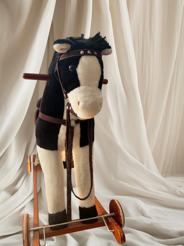 Дитячий кінь гойдалка, оббивка з мʼякої плюшевої тканини. Деревʼяний каркас, зручні деревʼяні ручки, мʼяке сидіння.