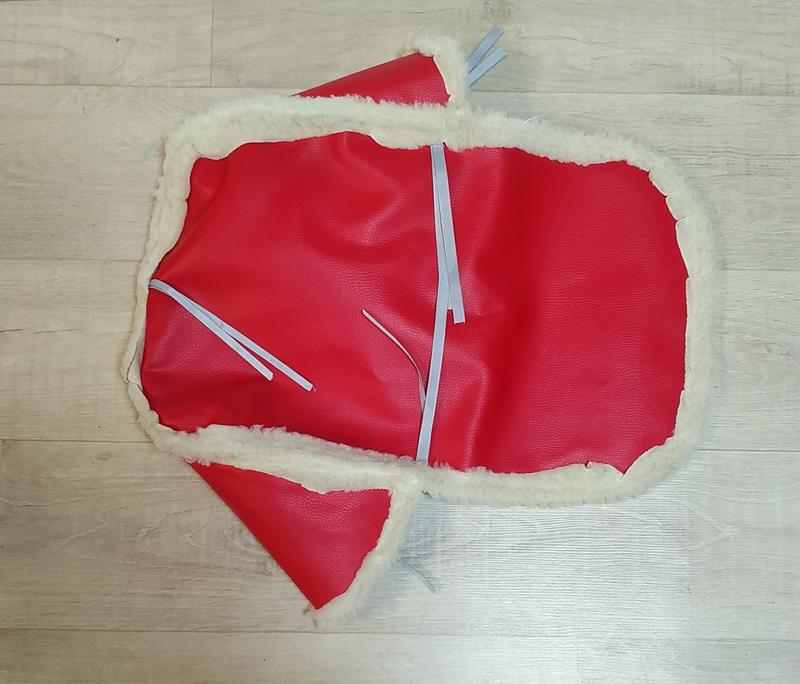 Теплий чохол для санчат червоного кольору на зав'язках, екошкіра та овчина.