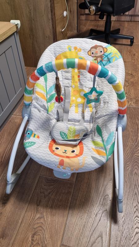 Крісло-шезлонг дитячий в дуже гарному стані. Підходить для дитини віком 0-3 роки. В кріслі є 2 положення для фіксації. Є стопор, який фіксує крісло від гойдання. Ремені безпеки регулюються, замок у справному стані. Є обруч, на якому підвішені 2 іграшки і можна додати свої. Внизу є пристрій на батарейках, який дає вібрацію, щоб вкласти дитину спати (вмикається за бажанням). Є оригінальна упаковка. Тканину на сидінні можна знімати і добре піддається пранню.