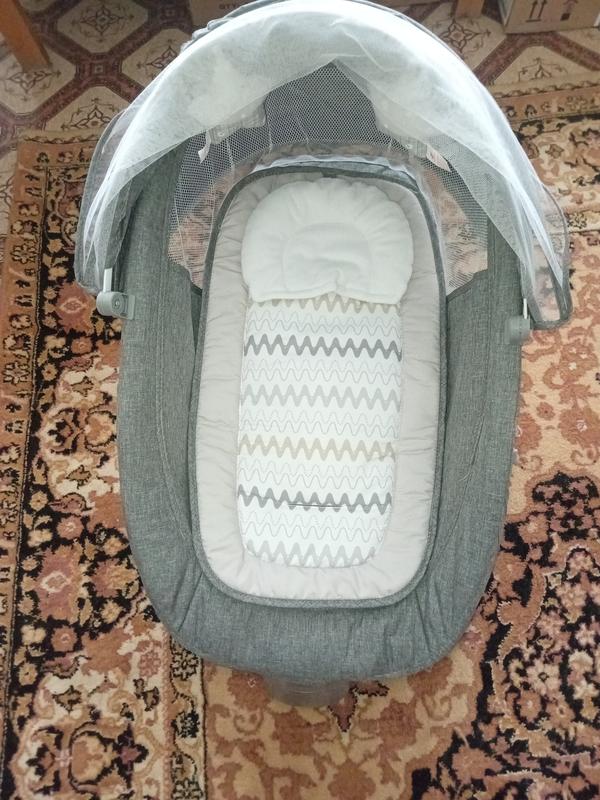 Характеристики: - таймер заколисування 15, 30, 45, 60 хвилин; - 5 швидкостей хитання; - 15 мелодій із можливістю використання регулювання гучності; - MP3+USB+Bluetooth ( за допомогою смартфона вмикайте колискові або відтворюйте білий шум); - керування можна здійснювати за допомогою програми (Android, iOS); - п'ятиточковий ремінь безпеки; - є блокатор хитання; - м'яких знімний вкладиш 61×34см; - на каптурі 2 підвісні іграшки; - капюшон із вбудованою москітною сіткою дозволить із комфортом використовувати шезлонг у дворі владного будинку; - кут нахилу спинки регульований від 132°-158°; - живлення за допомогою USB кабелю. Вага - 4.3кг.
