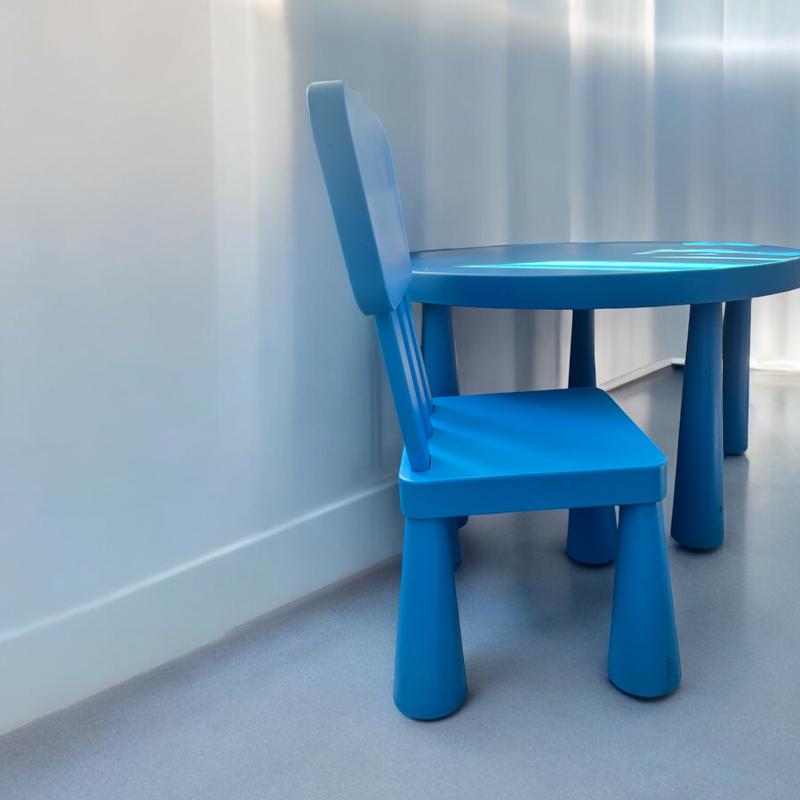 Детский стол Икеа. Диаметр 85см, высота 45 см. Изготовлен из безопасного пластика, цвет синий. В комплекте 3 кресла. Ширина кресла 39 см, глубина 36, высота 69 см. Можно использовать как в доме, так и на улице.