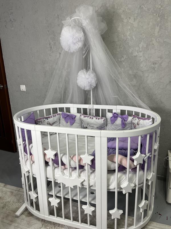 Дитяче ліжечко ingvart 9 в 1 білого кольору із зірочками З круглого в овальне Коли кругле , то є і пеленатор В комплекті є матрас на овальне ліжко.яке окремо купували В подарунок 4 простирадла. Та балдахін з тримачем.