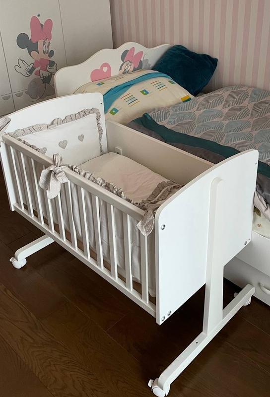 Ліжечко дитяче, до 6-8 місяців, розмір 93 см довжина, 56 см ширина, 79 висота. На колесах, одну сторону не чіпляли, щоб приставити до ліжка, в комплекті матрасик і постіль, все в гарному стані. Ціна 1500 грн