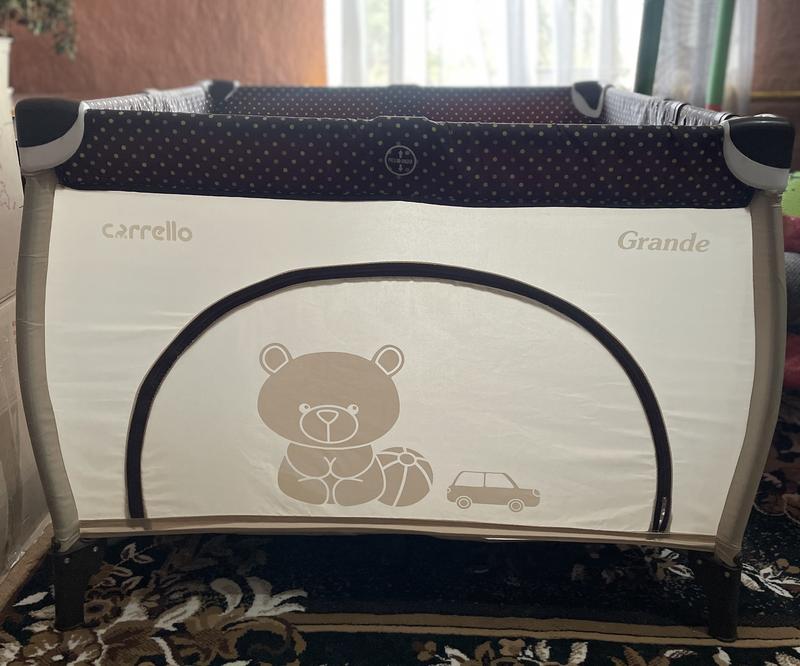 Квадратний манеж, на ніжках, складний, має матрасик і кільця для підйому. Є сумка, в яку складається. Додаткове відкривне бокове віконечко. Є дефекти використання, представлені на фото.