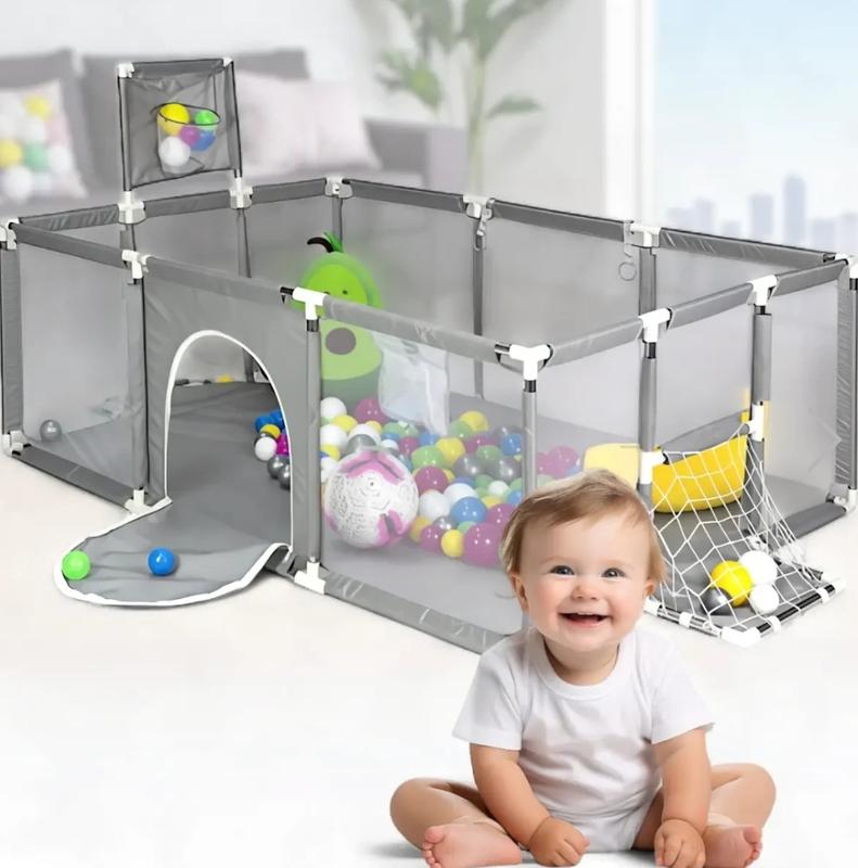 Дитячий манеж з сітчастими стінками, баскетбольним кільцем і воротами KP-82 180х120х62см Дитячий манеж KP-82 являє собою безпечний і функціональний ігровий простір для малюків.Його розміри 180×120 см і висота стінок 62 см забезпечують достатню площу для активних ігор, а посилений каркас робить конструкцію стійкою навіть при енергійній грі дитини. Сітчасті стінки дозволяють батькам спостерігати за малюком з будь-якого ракурсу і забезпечують вільну циркуляцію повітря. Манеж оснащений баскетбольним кільцем і воротами,що робить його універсальною ігровою зоною. Виготовлений з гіпоалергенної тканини, безпечної для ніжної шкіри дитини. Легке складання дозволяє швидко встановити манеж удома або взяти з собою в поїздку. Стильний сірий колір гармонійно вписується в будь-який інтер'єр і підходить як для хлопчиків, так і для дівчаток.