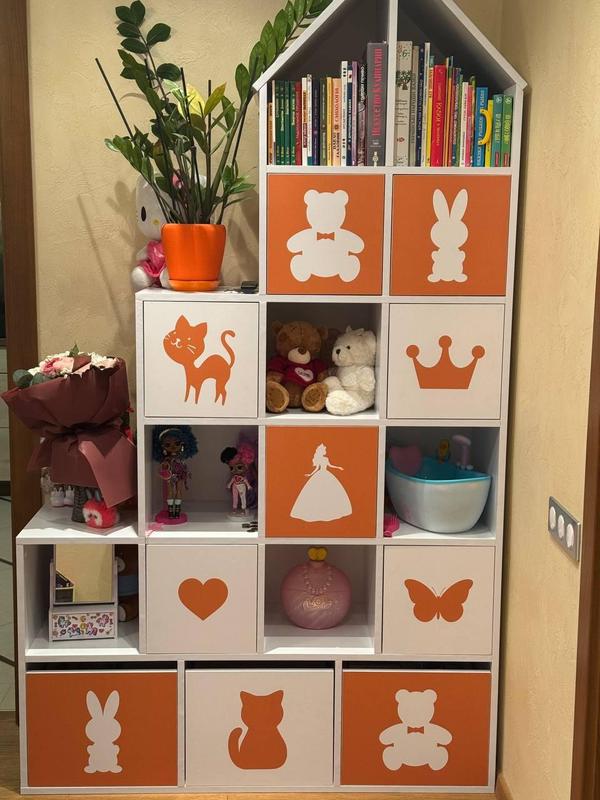 Стеллажи для детских игрушек домик 10 ящиков 17 ячеек цвет бело и оранжевый