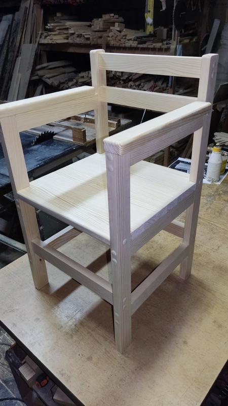 Стілець з підлокітниками для дитини з інвалідністю Сосна. Лак акриловий прозорий. Ціна 1400 грн Без покриття 1000 грн Висота загальна 63 см. Від підлоги до сидіння 34 см. Зовнішні габарити сидіння 35х35 см. Від сидіння до підлокітника 20 см. Під замовлення