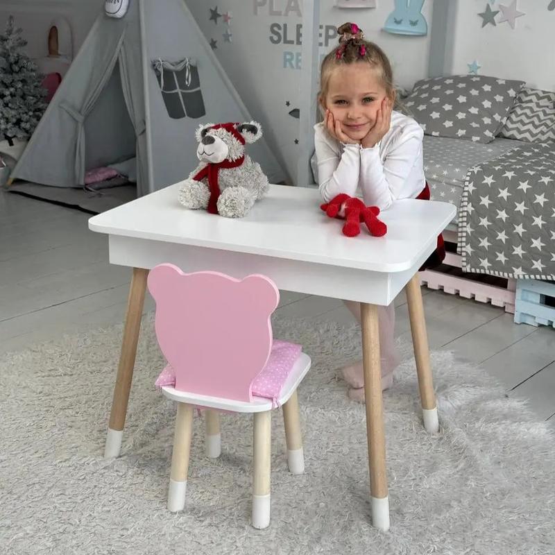 Дитячий столик білий і стільчик ведмедик рожевий. Столик із нішею для олівців і розмальовок Характеристики: Стіл із шухлядою: - Розмір (ВхДхШ): 53х60х45 см - Матеріал: Натуральне дерево та МДФ - Глибина ящика: 65 мм - Фарба: Екофарба. Не викликає алергії в діток - Підіймальний механізм: Фіксується у верхньому положенні Стільчик розміри: Розмір (ВхДхШ): 26.5х26х25 см Матеріал: Натуральне дерево та МДФ Фарба: Еко фарба. Не викликає алергії у діток Особливості наших меблів: 1. Цікавий дизайн 2. Просте збирання 3. Надійна та зручна у використанні конструкція 4. Підходить для навчання та ігор Виготовлений відповідно до госту для дітей 2 групи зросту (115-130 см) ⠀ Підходить для дітей від 1,5 до 7 років. ⠀Кришка з підіймальним механізмом, де міститься ящик для зберігання приладдя ⠀