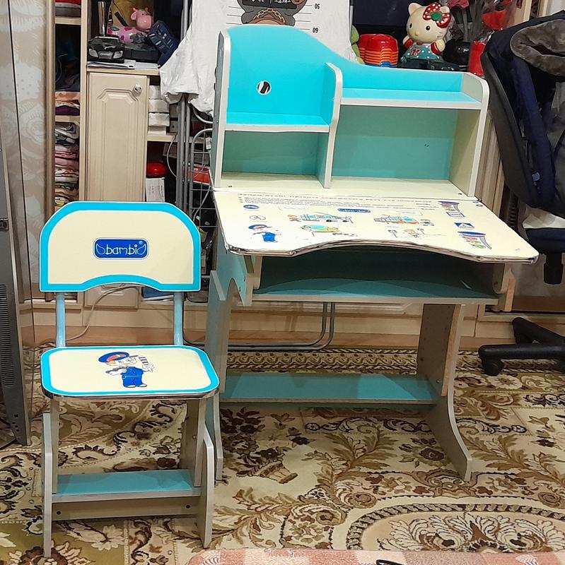 Парта дитяча зі стільцем регулюється по висоті, є полочки.