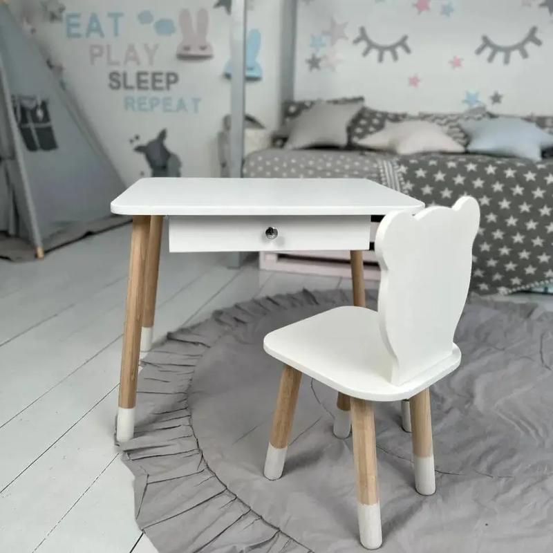 Дитячий столик зі стільчиком ведмедик білий для творчості та ігор ящик для олівців та розм...