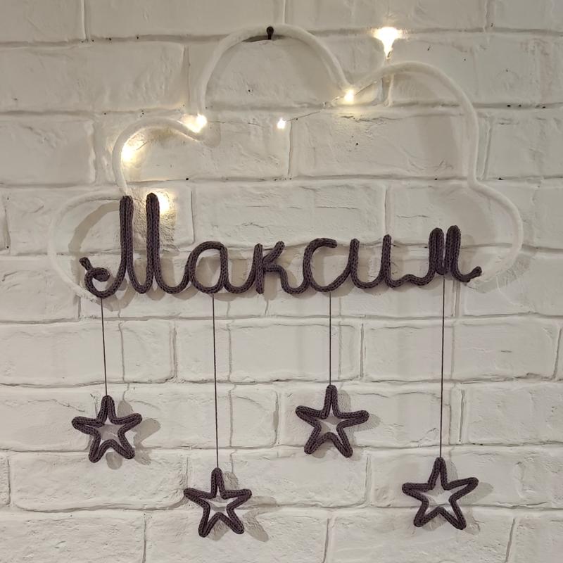 Декор ручної роботи. іменна хмаринка з ім'ям Максим. Підійде для зони над ліжечком чи сповивальним столиком. Гарно на подарунок для новонароджених. Виготовлено з алюмінієвої основи, ззовні обв'язано джгутом із пряжі. Хмаринка з пухнастої пряжі, що додає їй ніжності. Кольори можуть бути на ваш вибір (45 шт). Підвіски можна зробити інші. Термін виготовлення 1-2 дні.