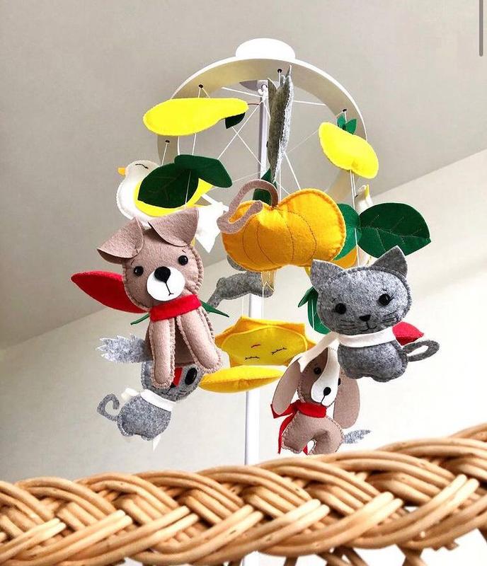 Нижній ряд - обличчя тваринок до дитинки Завдяки таким кольорам дитина зосереджує погляд на мобілі Кронштейн дерев'яна яний , механізм на 35 мелодій з регулятором гучності Ручна робота, замовляла за 1850 грн