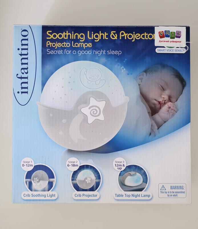 Для спокійного сну малюка важливо подбати про створення спокійної і м'якої атмосфери в спальні. І здатний допомогти в цьому світильник Infantino Спокійні сни, сірий, оснащений проектором і музичним модулем для відтворення колискових мелодій, а також заспокійливих звуків природи. Світильник виконаний у вигляді півсфери, яку можна закріпити вертикально на поверхні манежу для м'якого підсвічування або встановити на рівній поверхні, щоб він проектував забавні зірочки. У будь-якому випадку кімната наповниться заспокійливим світлом, яке, безсумнівно, посприяє швидкому засипанню дитини.
