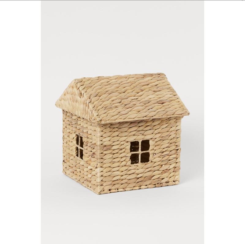 Контейнер для хранения в форме домика из плетеного водяного гиацинта. Крыша коттеджа является крышкой. Ширина 25 см, длина 25 см, общая высота 29 см. Имеются незначительные нюансы на фото отражены