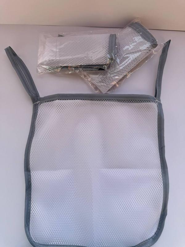 Сітка для іграшок на дитячий візок. Опис: • Матеріал: міцна та легка сітчаста тканина, що добре пропускає повітря. • Форма: прямокутна з міцними швами по краях. • Кріплення: зручні текстильні ремінці для фіксації на візку. • Колір: біла сітка з сірою окантовкою. • Призначення: використовується для зберігання іграшок, пляшечок, серветок та інших дрібниць під час прогулянок. Ця сітка робить перевезення дитячих речей зручнішим, допомагає підтримувати порядок і забезпечує легкий доступ до необхідних предметів.