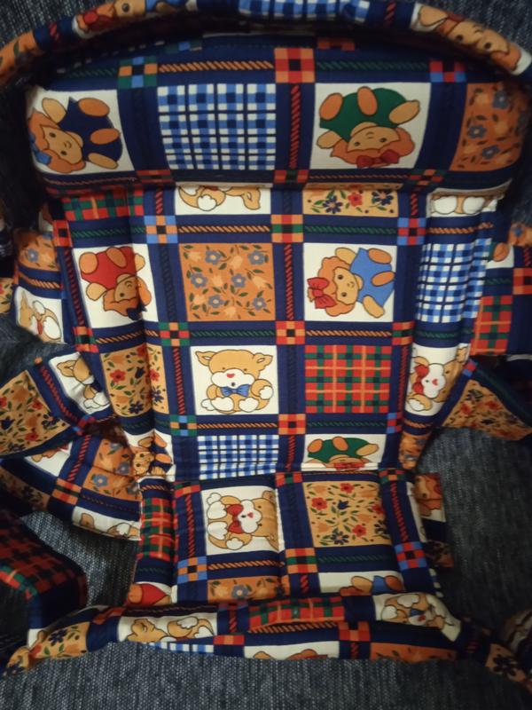 Дитяче кенгуру крісло, гарної якості,яскравого кольору. Товсті ремені з регулятором,крісло яке тримає спинку та форму.Нове в упаковці.