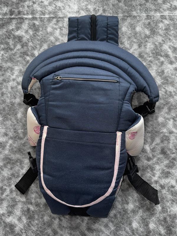 Рюкзак-кенгуру для дітей віком від 0 до 12 місяців; М'які шлейки, зручні клямки; Жорсткий підголівник та жорстка спинка; Модель дозволяє носити дитину як обличчям до себе, і від себе; Є кишенька для дрібниць; Звільняються руки, зменшується навантаження на спину мами. 4 положення: 1) Положення – лежачи. Широкі зручні плечові ремені з набивкою, що з'єднуються блискавкою; 2) Сидячи віч-на-віч з підтримкою голови; 3) Сидячи спиною до мами; 4) За спиною у мами. Склад 100% бавовна, наповнювач - поролон. Правильна жорстка спинка (виймається за потреби). Розрахований до 10 кг. Спинка може бути як твердою, так і м'якою. Ремінці регулюються залежно від зростання та ваги малюка.