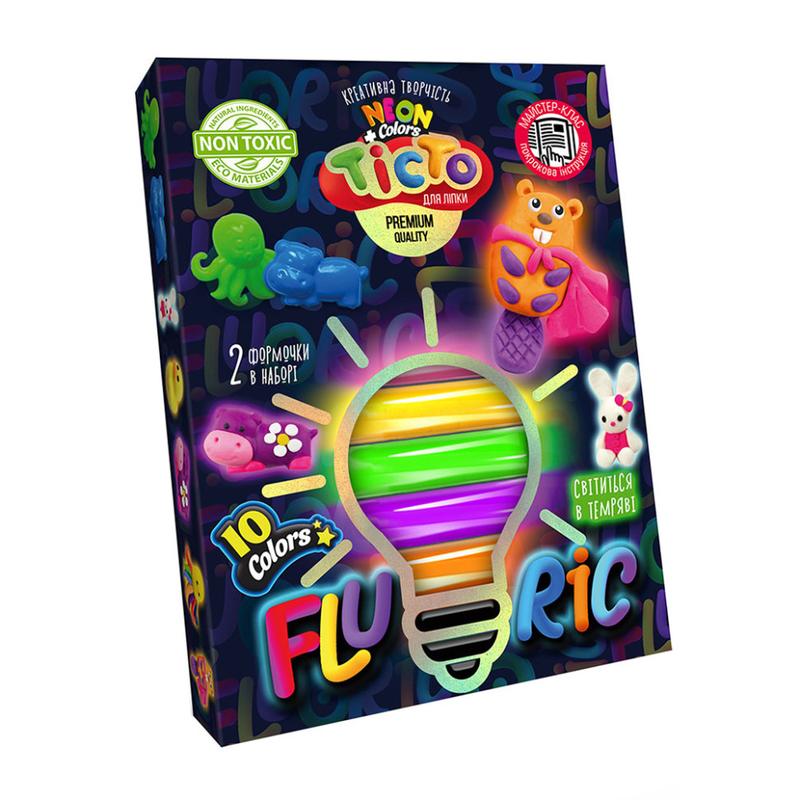 Креативна творчість "Тісто для ліплення" FLUORIC "коробка 10 кольорів. Добре тримає форму, дозволяє опрацьовувати досить дрібні деталі скульптури .Не липне до рук і поверхні. Ніжність і пластичність матеріалу сприяє розвитку тактильних відчуттів і дрібної моторики рук дитини. На відкритому повітрі тісто твердне протягом 24-х годин. для збереження еластичності зберігати в недоступному для повітря місці. Яскраве, світиться в темряві і не токсична. Вік 3 + .В наборі стек 1шт, формочки 2шт, тісто 10шт Розмір упаковки 13 * 18 * 2,5 см.