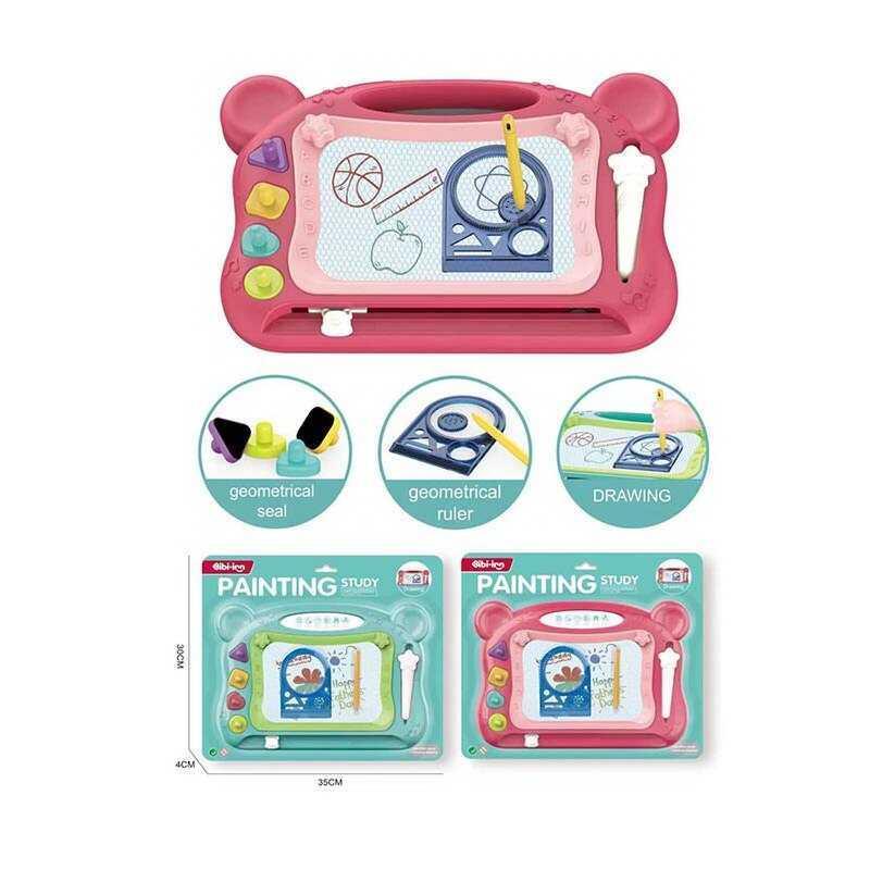 Малюй, вчися, фантазуй з новою дошкою для малювання Painting Study! Це корисний сучасний гаджет, який чудово впорається із завданням розважити дитину та дасть їй можливість втілювати свої мистецькі задуми у будь-якому місці. Магнітний наконечник ручки, плавно рухаючись поверхнею дошки, створює малюнок з намагніченої стружки. Для того щоб відновити полотно, необхідно просто простягнути убік важіль, який, як гумка, зітре старе зображення. Особливості: - Ергономічний дизайн; - 2 ручки з магнітними наконечниками; - Розмір полотна для малювання: 17х11 см; - Лінійка для створення оригінальних візерунків; - Набір доповнений магнітними штампами; - Зручна ручка для перенесення; - вікова категорія – 3+. Увага. Виробник залишає за собою право змінювати комплектацію, колірну гаму та характеристики товару без попереднього повідомлення. .