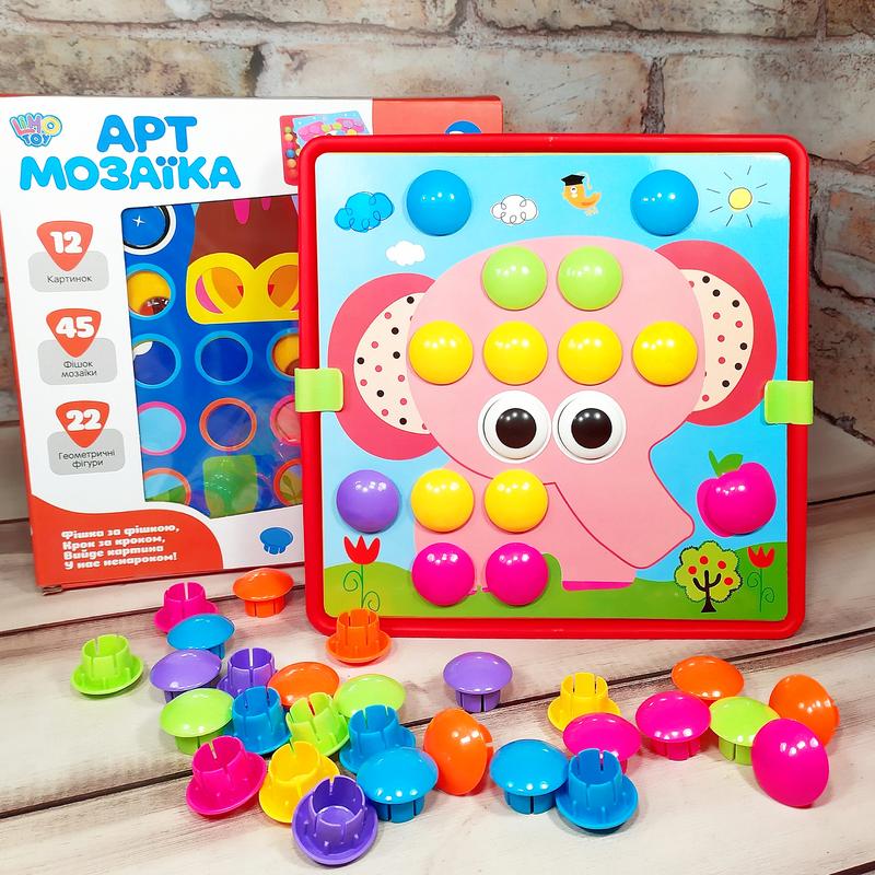 🕯 Вік: 2+ 🛍 Комплектація: 1 коробка-поле для зберігання мозаїки, 12 картинок, 45 фішок + 2 тримачі. 📏 Розміри: - картинки: 21,2*21,2 см; - коробки-поля: 23*23*3,6 см; - фішки: діаметр 3 см; - упаковки: 23,5*23,5*4,7 см. 🧰 Матеріал: пластик, ламінований картон (картинки). 🛠️ Виробник: Limo Toy.