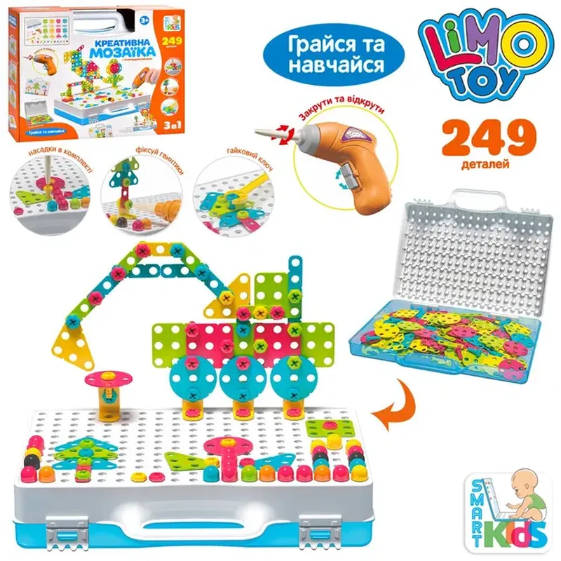 Мозаїка M 5590 3в1 — це захоплююча розвиваюча іграшка для дітей, яка поєднує гру, конструювання та розвиток дрібної моторики. Ідеальний варіант для подарунка дітям від 3 років. Комплектація: 249 деталей для складання Шуруповерт з обертовою насадкою Викрутка Гайковий ключ Пластикова валіза для зберігання Можливості гри: Складання фігур з мозаїки Закручування шурупів за допомогою інструментів Розвиток логіки, уяви та моторики Гра в майстра — як справжній конструктор Переваги: 3в1 — мозаїка, інструменти, кейс Яскраві кольори — приваблюють увагу Безпечні матеріали — для дітей від 3 років Зручно брати з собою — все в компактній валізі #мозаїка #розвиваючііграшки #іграшкадлядітей #шуруповерт #дитячийнабір #іграшкамайстра #подарунокдитині #мозаїка3в1 #M5590 #інструментидлядітей #дитячийрозвиток