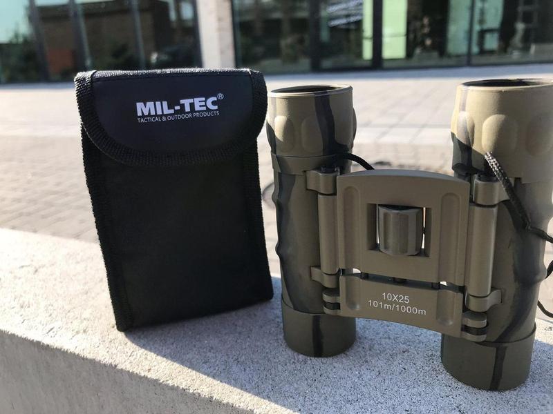 Складаний Бінокль MIL-TEC GEN II 10X25 FERNGLAS FALTBAR BLACK 15702002 Компактний бінокль від Mil-Tec з фіксованим збільшенням 10x і діаметром об'єктива 25 мм. Завдяки компактним розмірам і хорошим оптичним характеристикам, він стане чудовим елементом спорядження для будь-якого мандрівника. Конструкція бінокля побудована на основі системи призм типу Roof, в якій об'єктивні лінзи суміщені з об'єктивними лінзами прицілу. Всі оптичні елементи розміщені в міцному, високоякісному пластиковому корпусі, який з'єднаний між собою мостом. Корпус з'єднаний шарнірно, що дозволяє скласти бінокль до компактних розмірів. Значним покращенням у користуванні біноклем є використана система Central Focus - керування фокусуванням зображення в обох окулярах прицілу за допомогою однієї ручки. Бінокль оснащений діоптрійною корекцією окулярів, що дозволяє використовувати його з власними корекційними окулярами. У набір входить: - нейлоновий чохол з можливістю кріплення на ремінь, - тканина для оптики, - ремінець на шию. Технічні характеристики Збільшення: 10x Об'єктивний діаметр: 25 мм Поле зору м/1000м: 101 m Вихідна зіниця (мм): 2,48 мм Система Призма: Roof Фокусування: центральне - інтегроване регулювання фокусування для обох окулярів Мінімальний фокус: 7 м Розміри: 120 x 70 x 40 мм Вага: 220 г Колір: Black Можливість встановлення на штатив: немає Виробник: Mil-Tec, Німеччина