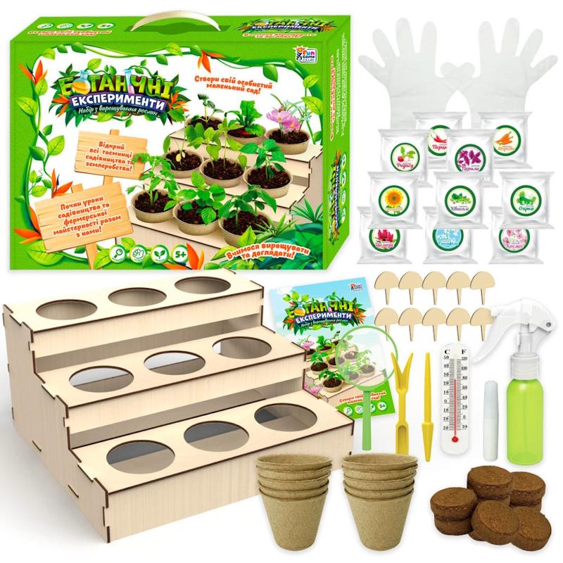 Дитячий набір для створення власного маленького саду юним фермером. У наборі: - Трирівнева підставка під розсаду; - Картонні горщики для розсади; - Пакетики з насінням; - Градусник; - Пляшка з розпилювачем; - Лупа; - Брикети ґрунту; - Інструменти для садівництва; - Кілочки для позначення видів рослин; - Докладна кольорова інструкція; Ґрунт був попередньо продезінфікований за високої температури. Розмір коробки: 36х25х9 см.