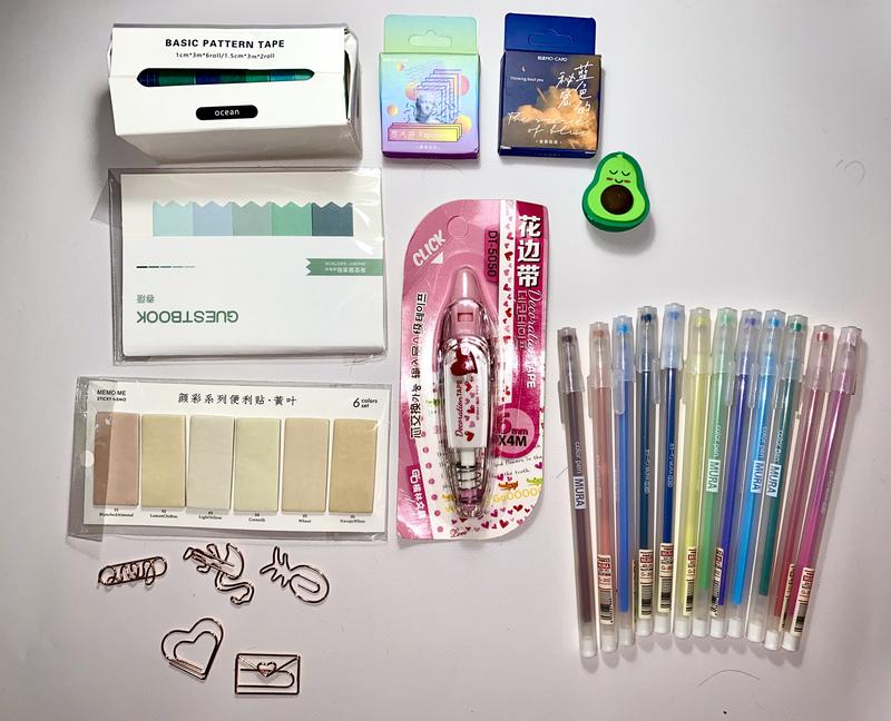 В набір входить: 1. Набір стрічок для скрапбукінга (8шт/уп) - 1 шт 2. Набір наклейок для скрапбукінга(45шт/уп) - 2 шт 3. Гумка « Авокадо» - 1 шт 4. Стікери «прапорці» - 1 шт 5. Корегувальна стрічка - 1 шт 6. Стікери для поміток 6 шт - 1 шт 7. Набір гелевих кольорових ручок 12 шт - 1 шт 8. Набір скрепок з рожевого золота - 5 шт