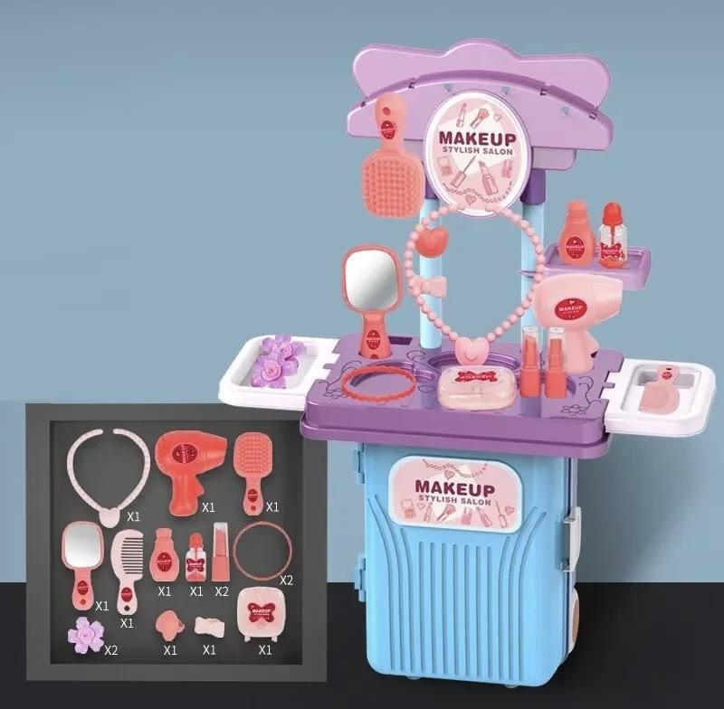 Характеристики: Возраст: 3+ Материал: Пластик Вид сюжетно-ролевой игры: Салон красоты Комплектация: Чемоданчик Зеркало 1 шт Расческа 1 шт Гребешок 1 шт Фен 1 шт Палетка с тенями 1 шт Парфюм 2 шт Помада 2 шт Заколки 2 шт Браслеты на руку 2 шт Кольца 2 шт Ожерелье 1 шт Наклейки с названием салона