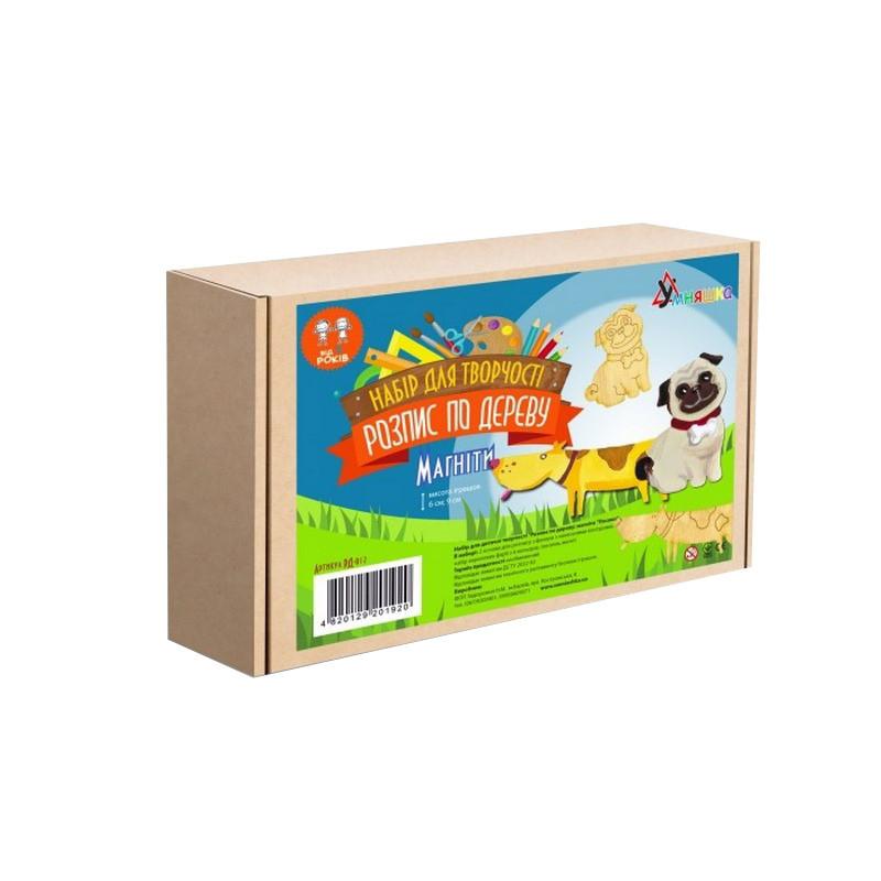 Опис Набір для творчості «Розпис по дереву »Магніти-собачки» Розмір коробки ДхШхВ см 16,5х4,2х11,4. Розмір готових виробів 9,5 і 6 см. У наборі: 2 основи для розпису з фанери з нанесеними контурами, набір акрилових фарб із 6 кольорів, пензлик, магніт. Для дітей від 6 років і старше.