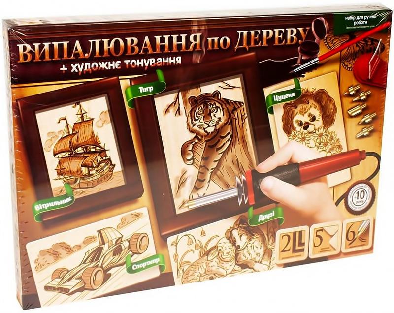 Набор для выжигания по дереву имеет 6 сменных насадок и 5 заготовок с рисунками ("Парусник", "Спорткар", "Тигр", "Щенок", "Друзья"). Широкий наконечник -- для выжигания больших плоскостей, тонкий наконечник -- для выжигания тонких линий и мелких деталей, перьевой наконечник -- для выжигания линий разной толщины. Выжигательный прибор для удобства оснащен подставкой для удерживания (охлаждения). Для того, чтобы работа по дереву не ограничивалась только выжиганием, в набор для творчества входят тонировка, кисточка и рамки. Поверх готовой работы, аккуратно, специальной краской, наносится слой тонирующего покрытия, что придает текстуре дерева художественный окрас и создает иллюзию реалистичности. В комплект входит: Декоративная рамка - 2 шт. Заготовка для создания картины - 5 шт. Насадки для выжигания -6 шт. Электро -- выжигатель -1 шт. Подставка для выжигатель -1 шт. Тонирующая краска - 1шт. Кисточка - 1шт. Инструкция по работе. Размер коробки 37 * 4 * 25 см.
