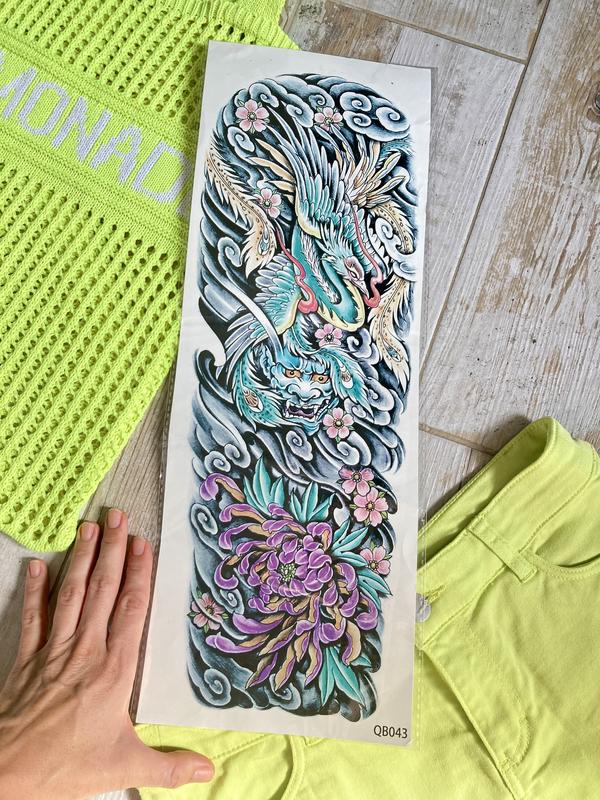 Тимчасове татуювання. 17*48 см. Легко наносяться на тіло за допомогою води. Виглядають як справжні. Водостійкі та тримаються до 7 днів. Інструкція щодо нанесення: 1. Зніміть захисну плівку та прикладіть перекладну тату малюнком до тіла. 2. Змочіть тату вологою серветкою із зовнішнього боку, легко притискаючи папір до тіла близько 30 секунд. 3. Обережно зніміть папір і насолоджуйтесь тимчасовим татуюванням.