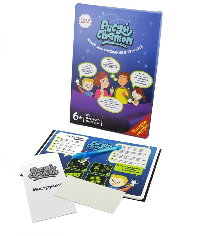 Малюй світлом A4 Унікальний світловий планшет "Малюй світлом" відмінно подарунок, який надовго займе як будь-якої дитини, так і підійде для спільної творчості дітей та батьків! Світловий планшет являє собою фотолюминисцентный ПВХ матеріал у рамці, який швидко накопичує світло від штучного або природного джерела освітлення і потім деякий час світиться в темряві поступово затухаючи. Унікальність планшета полягає в тому, що для роботи з ним не потрібно додаткових витратних матеріалів, малюнки поступово зникають, а замість них можна наносити нові фотографії. В комплекті: - Планшет з ПВХ - Ручка з ліхтариком - Трафарет з літерами - Трафарет з зірками - Інструкція - Коробка - Спеціальний подарунок - кольоровий трафарет Id vv10371