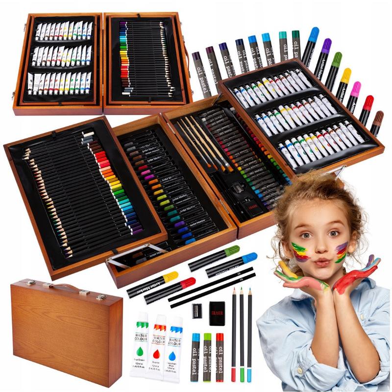 Набір для малювання 174 елементів, набір для творчості, живопису, набір для художників, валіза для малювання Елегантна, розкладна, дворівнева дерев'яна валіза, що підвищує її естетичну цінність, а також забезпечує довговічність, зручну в транспортуванні. Окремі відсіки дають легкий і швидкий доступ до необхідних предметів, а також забезпечують їхній захист і підтримку ладу у валізі. Набір функціональний і складається з 174 корисних частин. Велика кількість дасть змогу реалізувати різні творчі ідеї. ТЕХНІЧНА ХАРАКТЕРИСТИКА - габарити валізи (довжина/ширина/висота): 44,5/31/9,6 см, — вага комплекту: 3,75 кг, вага з упаковкою: 4,15 кг вік: від 3 років колір валізи: коричневий матеріал валізи: дерево, метал Дворівнева конструкція дає змогу легко дістатися необхідних аксесуарів. Цей набір придатний для використання як старшими, так і молодшими особами, незалежно від статі; рекомендується для індивідуального використання вдома, а також як обладнання для приватних шкіл, що пропонують курси малювання. 174 елементи для малювання, а саме: 54 олійні пастелі 42 фломастери 34 кольорові олівці 12 акварельних (водних) фарб (12 мл) 12 акрилових фарб (12 мл) 12 олійних фарб (12 мл) 2 круглі пензлики (розміри 2 та 4) 2 щітки пензлика (розмір 6 і 8) 1 стругачка 1 олівець із твердістю 2 В 1 олівець із жорсткістю HB 1 гумка