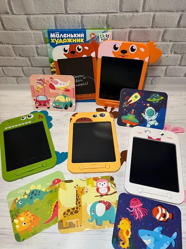 Планшет подойдет как на самый маленький возраст: поскольку развивать моторику, при этом малыш не запачкается, и ничего не окутал за пределами доски, а это сохранит нервы родителей. Также планшет отлично подойдет и для детей старшего возраста. С его помощью можно учиться - решать примеры, или, например, рисовать карикатуры друзей. Очень удобно взять с собой в путешествие, и банально сыграть в "крестики-нолики" в дороге. В основе экрана лежит рк технология, и изображение будет оставаться на планшете столько, сколько нужно. Для этого на задней поверхности устройства есть кнопка, которая блокирует и разблокирует возможность стирать картинки или записи. А чтобы все стереть – нужно лишь нажать кнопку на панели, и поверхность мгновенно очистится. Цветная ЖК-поверхность для рисования имеет несколько оттенков. Досточка представлена в 4-х цветах и выполнена в виде различных животных. В комплект входит пластиковый "карандаш". Размер планшета: 30*20*1 см. Размер доски для рисования: 16*19 см.