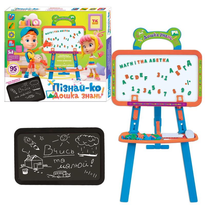 Відкрийте для маленьких розумників дивовижний світ знань разом з магнітною дошкою від "TK Group"! Долучайте маленьких непосид до цікавої гри, під час якої вони познайомляться з цифрами, а також українською та англійською абетками. Можна складати перші слова, вигадувати чудернацькі комбінації з літер, знаходити прості рішення, грати у відгадайку та головне - малювати! Двостороння дошка дозволяє малювати як маркерами, так і крейдою. Тож обирайте свій зручний інструмент художника та починайте творити разом із "Пізнай-ко"! Особливості: - 95 елементів; - розміри мольберта у зібраному вигляді: 45х43х95 см; - розміри дошки: 45х31 см; - дошка є двосторонньою з одною стороною для маркерів, а іншою для крейди; - до набору включено магніти із літерами української та англійської абеток, а також цифр та математичних дій; - до набору додано маркер для білої дошки та крейду; - у комплект включені наліпки для декорування зібраного мольберта; - елементи набору виконано з міцного та легкого первинного пластику.