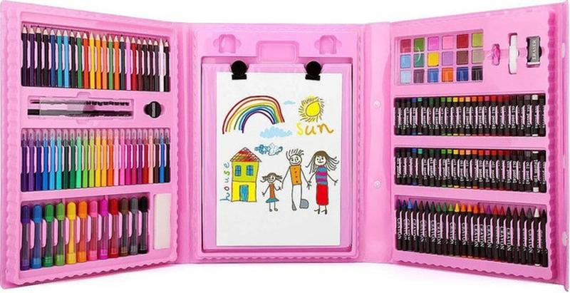 Маленькі фломастери - 12 шт. Акварельні ручки – 24 шт. Масляна крейда - 48 шт. Воскова крейда - 24 шт. Кольорові олівці – 24 шт. Акварельні фарби – 18 шт. Крістільний папір - 15 шт. Канцелярські скріпки – 30 шт. Великі кліпси – 4 шт. Простий олівець – 1 шт. Гумка - 1 шт. Стругачка - 1 шт. Палітра – 1 шт. Клей – 1 шт. Пензлик - 1 шт. Лінійка – 1 шт. Мольберт – 1 шт. Губка – 1 шт.