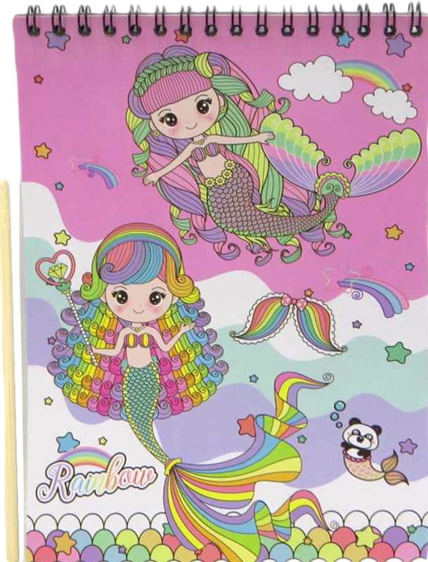 Граттаж - це спосіб виконання картин, методом процарапування зображення на картоні гострим інструментом. Малюнки в такій техніці відрізняються контрастом яскравих ліній і чорного фону, схожі на гравюри. У набір входить блокнот на спіралі з 8 чорними листами і дерев'яний штрихель. Заготовки із спеціальним шаром хаотично пофарбованих у веселкові кольори, який покритий захисною фарбою.