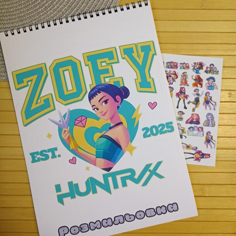 Розмальовка (формат А4) 12 зображень + стікерпак Анімаційний фентезійний музичний фільм сюжет якого розповідає про вигаданий кейпоп-гурт дівчат під назвою Huntr/x, учасниці якого ведуть подвійне життя -- зірок сцени вдень і мисливиць на демонів уночі. Їм доводиться протистояти суперницькому бойз-бенду Saja Boys, чиї учасники насправді виявляються демонами.