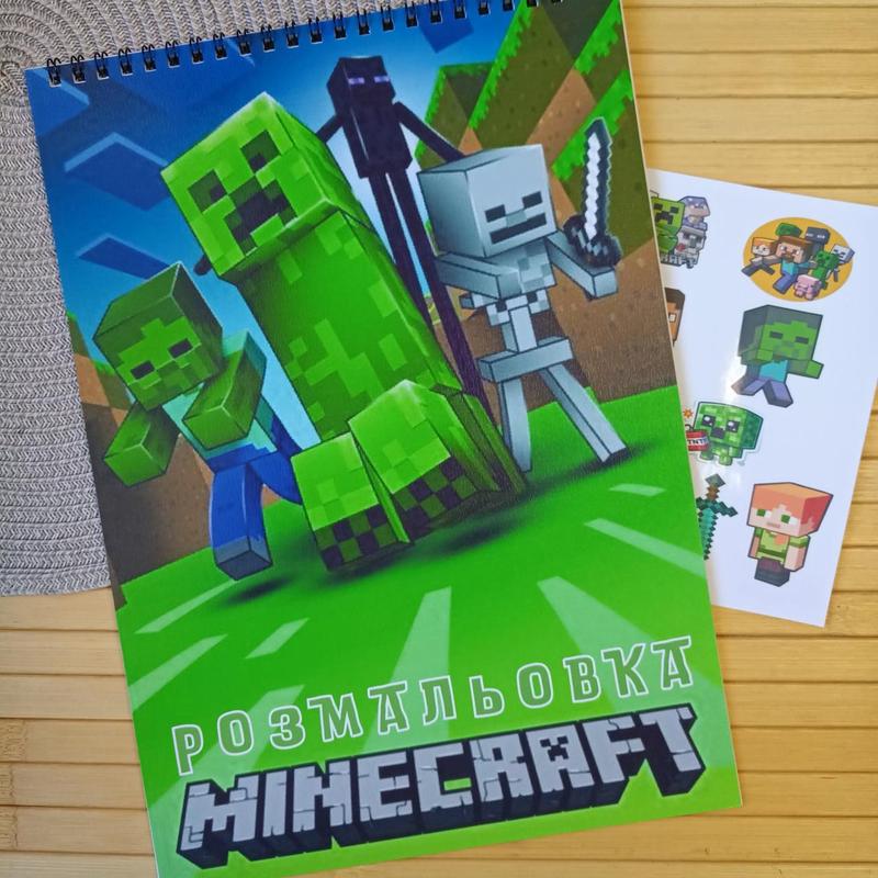 розмальовка форматом А4, 8 зображень + у подарунок стікерпак Minecraft -- відеогра в жанрі пісочниці у відкритому світі з поглядом від першої/третьої особи, розроблена та видана Mojang Studios у 2011 році. Гра започаткувала однойменну серію, для всіх творів якої характерний мінімалістичний кубічний дизайн