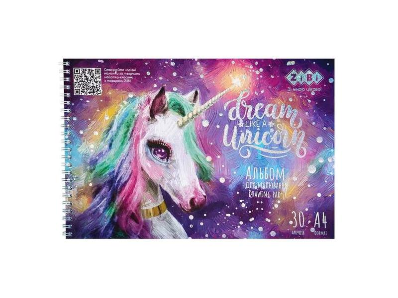 Альбом для рисования 30арк. rainbow unicorn, а4, 120г/м2 на пружине, сиреневый, kids line...