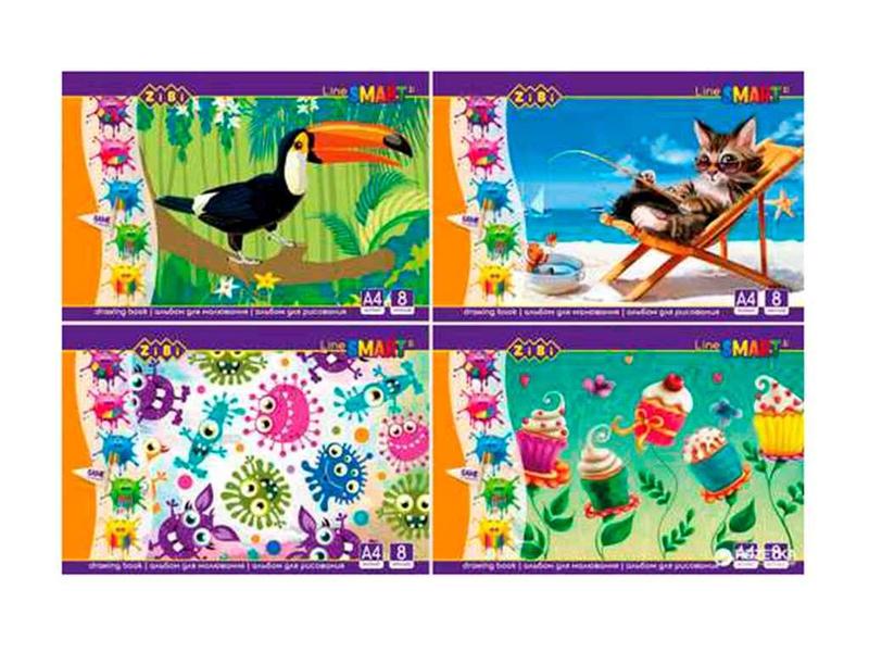 Альбом для малювання, А4, 8 аркушів, 100 гм2, на скобі, SMART Line ZB.1413 ТМ MILAN Альбом для малювання ZIBI Smart Line:формат А4 кількість аркушів - 8 щільність 100 г/м2 тип кріплення – на скобі обкладинка – повнокольорова обкладинка, покрита захисним лаком упаковка: по 40 альбомів в 4 дизайнах асорті Матеріал: Папір