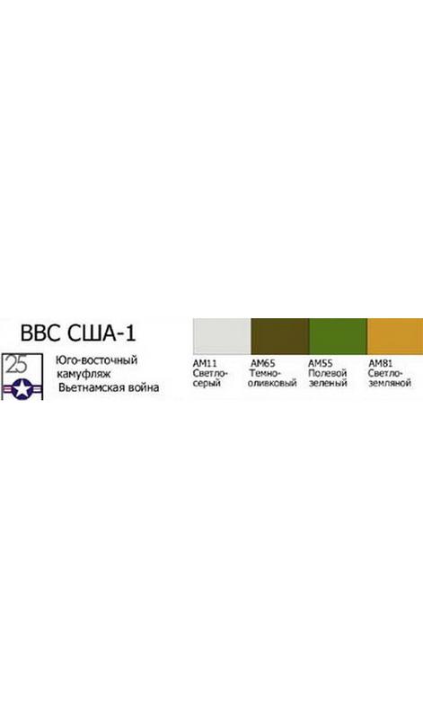 Тематичний набір акрилових фарб Хома "ВВС США-1". Південно-східний камуфляж.В'єтнамська війна. Набір акрилових фарб Хома 4 шт. по 12 мл: - АМ11 Світло-сірий - АМ65 Темно-оливковий - АМ55 Польовий зелений - АМ81 Світло-земляний Фарба призначена для фарбування дерева, паперу, пластику, металу за допомогою пензля або аерографа. Фарба негорюча, нетоксична, не має неприємного запаху, упакована в чотири пластикові баночки об'ємом 12 мл. Починати фарбування треба з основного тону або світлого відтінку камуфляжу.Поверхня, яка фарбуватиме, обов'язково знежирити. Для забезпечення кращого зчеплення фарби з фарбованою поверхнею можна використовувати акриловий ґрунт.Для аерографа фарбу треба розвести дистильованою водою. Розпилювати потрібно тонким шаром після остаточного висихання попереднього шару. Повна полімеризація фарби настає через 24 години, після чого фарба не змивається водою. Відразу після завершення роботи, пензля й аерограф необхідно ретельно вимити.