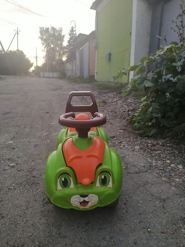 Якісна машинка-толокар, яка прослужила вірою і правдою нам, і з легкістю прослужить і вам 😊 Проїде по будь-якій дорозі🤞Наклейки всі цілі, стан дуже хороший. Відкривається багажник, в якому можна перевозити іграшки, та капот спереду. Купувала нову в магазині "Пузя". Після однієї дитини.